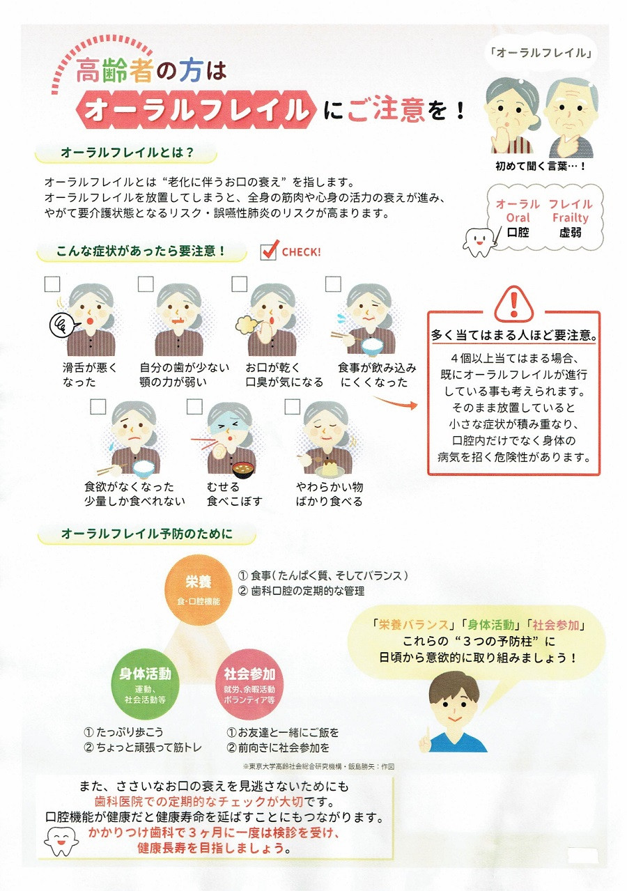 高齢者の方はオーラルフレイルにご注意を! 2020/11/09 オーラルフレイルとは“老化に伴うお口の衰え”を指します。 オーラルフレイルを放置してしまうと、全身の筋肉や心身の活力の衰えが進み、やがて要介護状態となるリスク・誤嚥性肺炎のリスクが高まります。