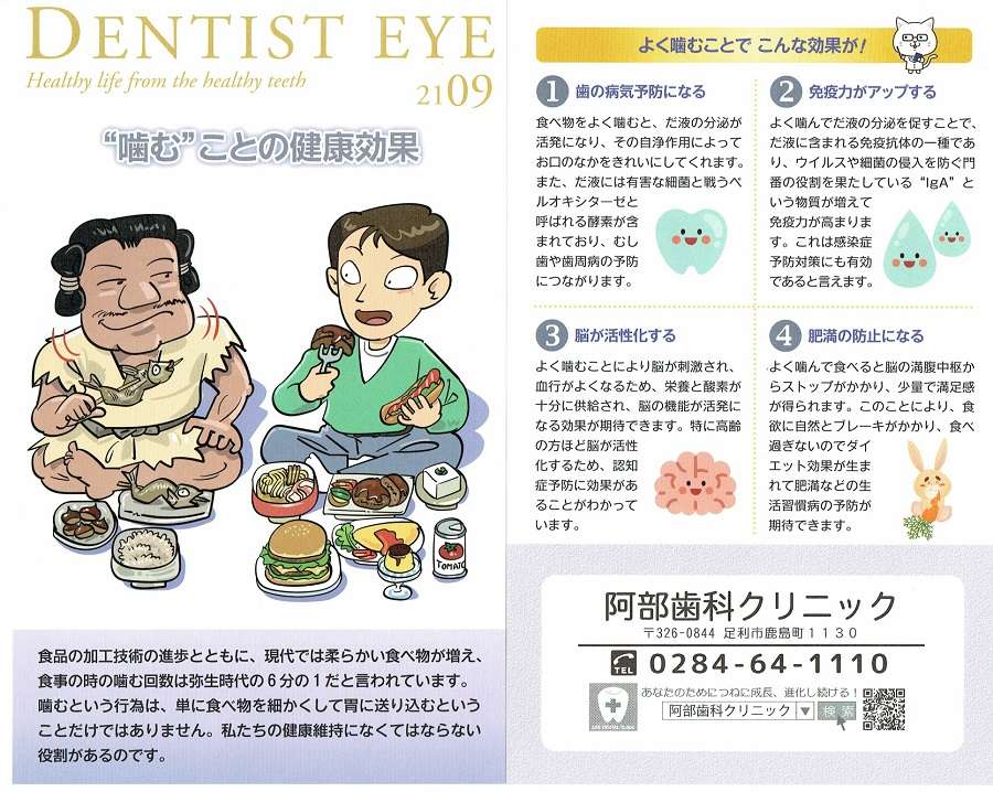 DENTIST EYE 2109 2021/09/05 “噛む”ことの健康効果 食品の加工技術の進歩とともに、現代では柔らかい食べ物が増え、食事の時の噛む回数は弥生時代の6分の1だと言われています。 噛むという行為は、単に食べ物を細かくして胃に送り込むということだけではありません。私たちの健康維持になくてはならない役割があるのです。