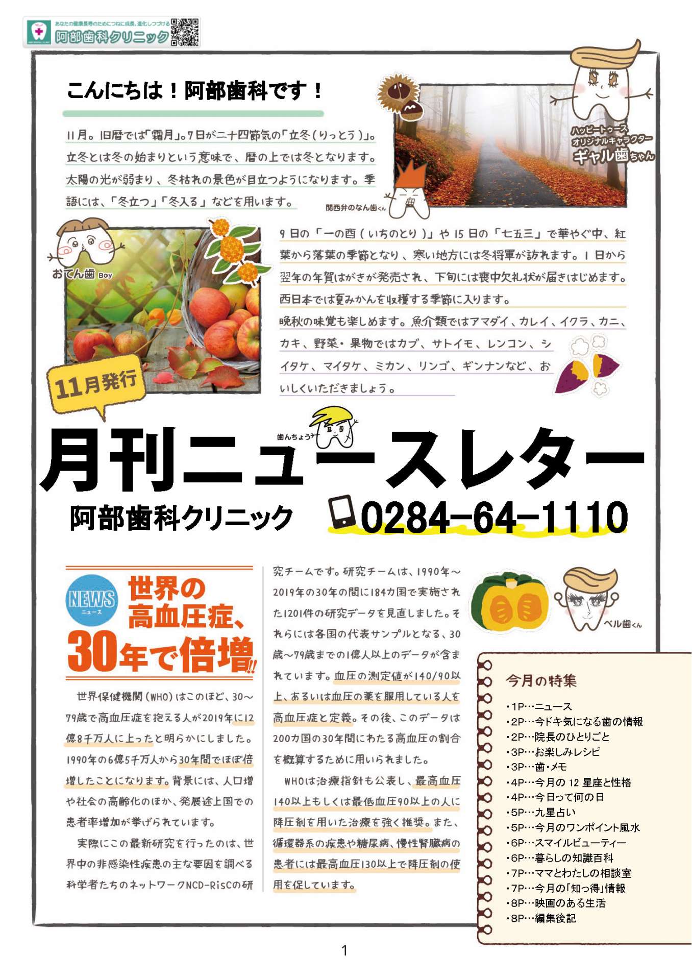 あなたの健康長寿の為に阿部歯科をご利用ください。 ~健口から健幸へ~ まずはお口の健口から始めませんか? 阿部歯科が毎月お送りする健康長寿に役立つ情報満載の月刊ニュースレター11月号ができました。 限定50部を院内で無料配布中! また、阿部歯科オフィシャルサイトでも閲覧できますのでぜひご覧ください。http://abe-shika-clinic.jp
