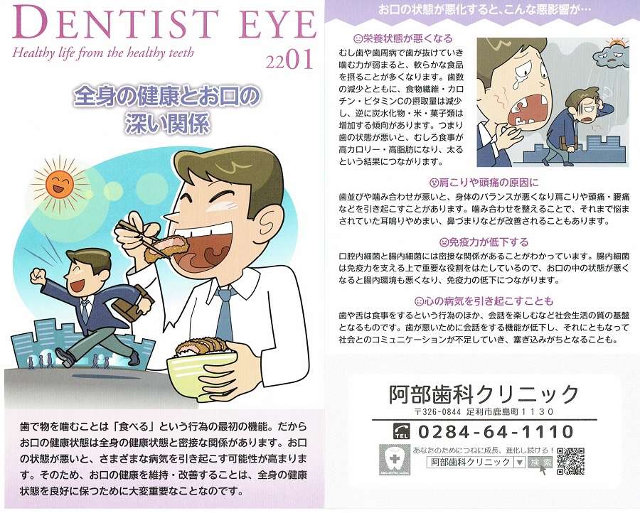 全身の健康とお口の深い関係 歯で物を噛むことは「食べる」という行為の最初の機能。だからお口の健康状態は全身の健康状態と密接な関係があります。お口の状態が悪いと、さまざまな病気を引き起こす可能性が高まります。そのため、お口の健康を維持・改善することは、全身の健康状態を良好に保つために大変重要なことなのです。