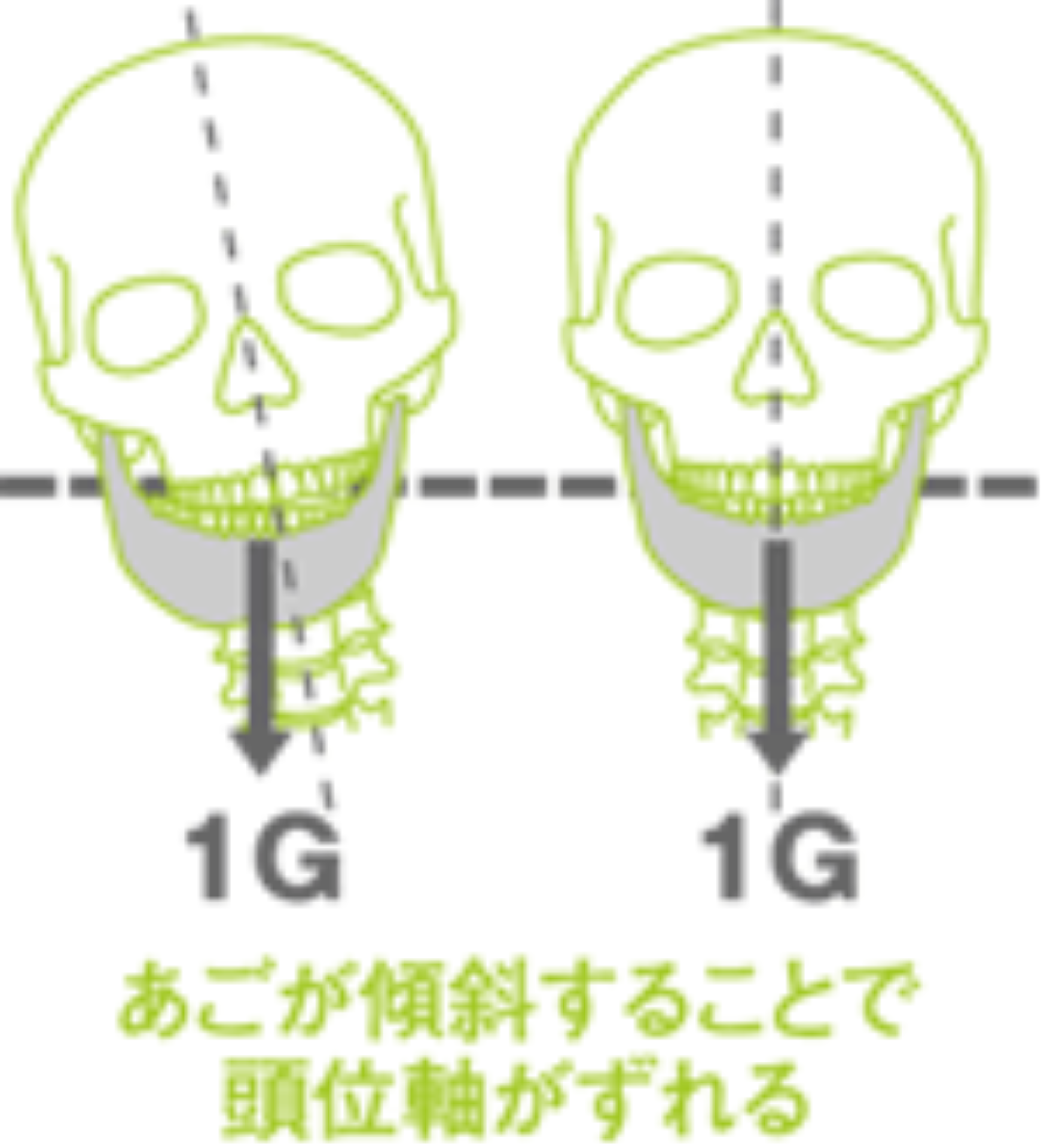ところが食生活習慣や態癖などの原因で下アゴがずれると、重力があるため、直立二足歩行の人間は無意識に頭位軸を傾斜させ、身体をねじってバランスをとろうとします。