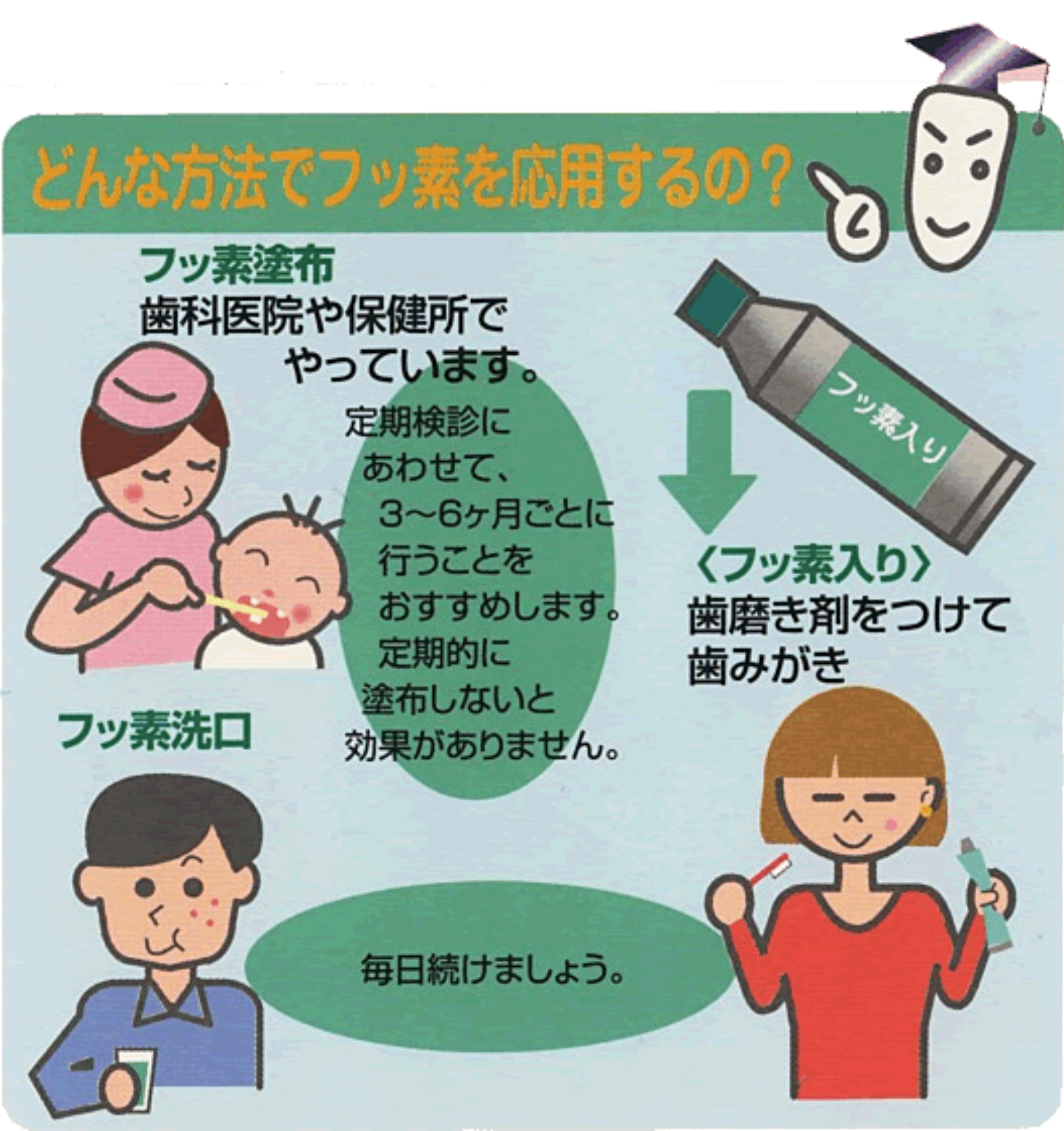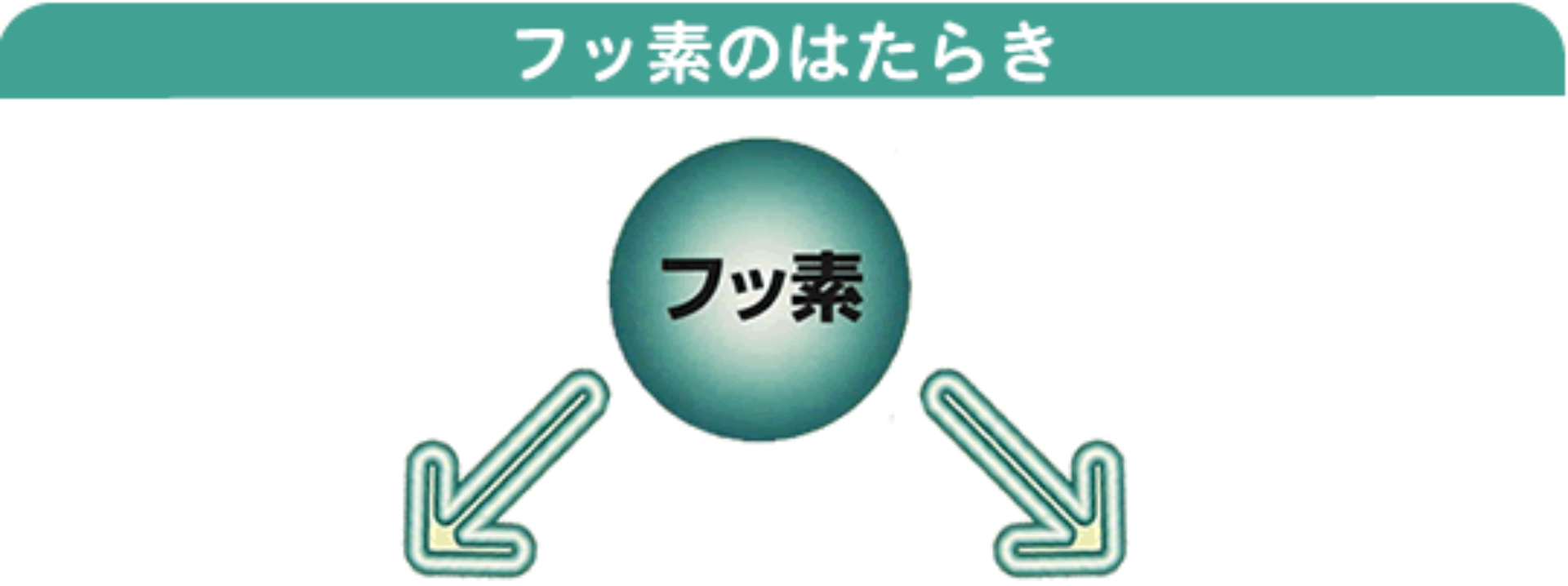 フッ素のはたらき-上手にとりいれてムシ歯予防 2019/12/16 口の中の環境(プラーク・だえき) に働きかける 抗酸化作用 抗菌作用 酸産生の抑制 細菌の働きを抑制して酸を作らないようにします。 歯に働きかける フルオロアパタイトの生成 エナメル質に耐酸性の強い結晶を作ります。 再石灰化の促進 ごく初期のムシ歯なら自然に再修復してくれます。 歯質強化 予防歯科