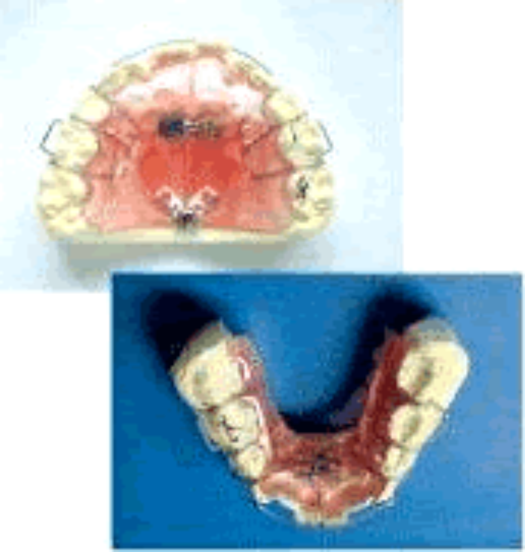 写真のようなネジ付き装置で少しづつ(1ヵ月約1㎜)顎を広げて、永久歯を正しい位置に誘導します。