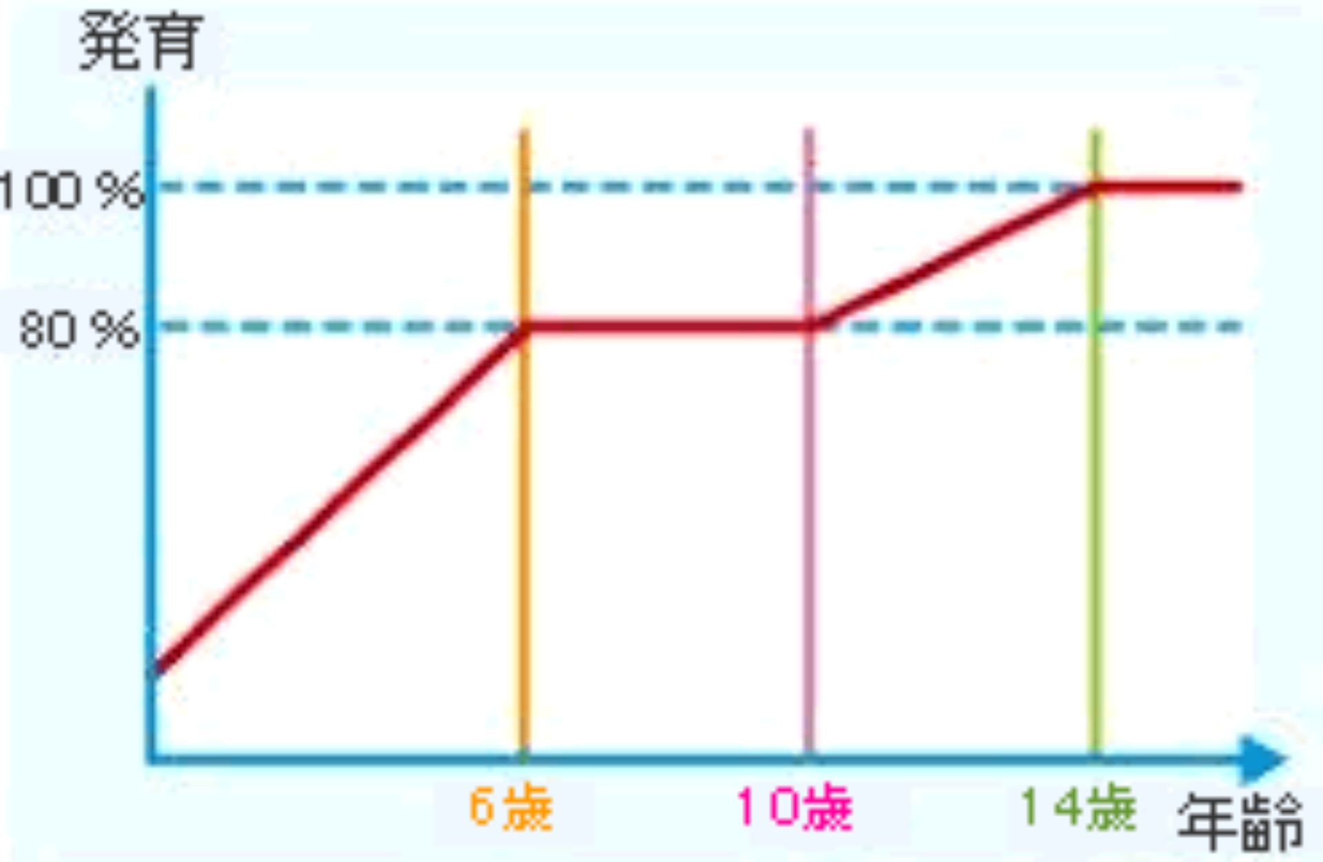 10~12歳にかけて再び発育、女の子は14歳 頃までにほぼ発育が終了します。 |