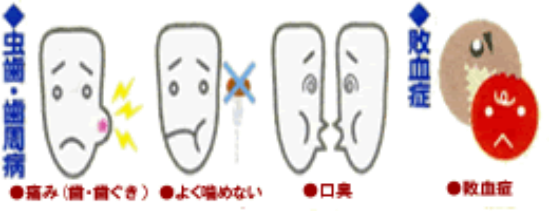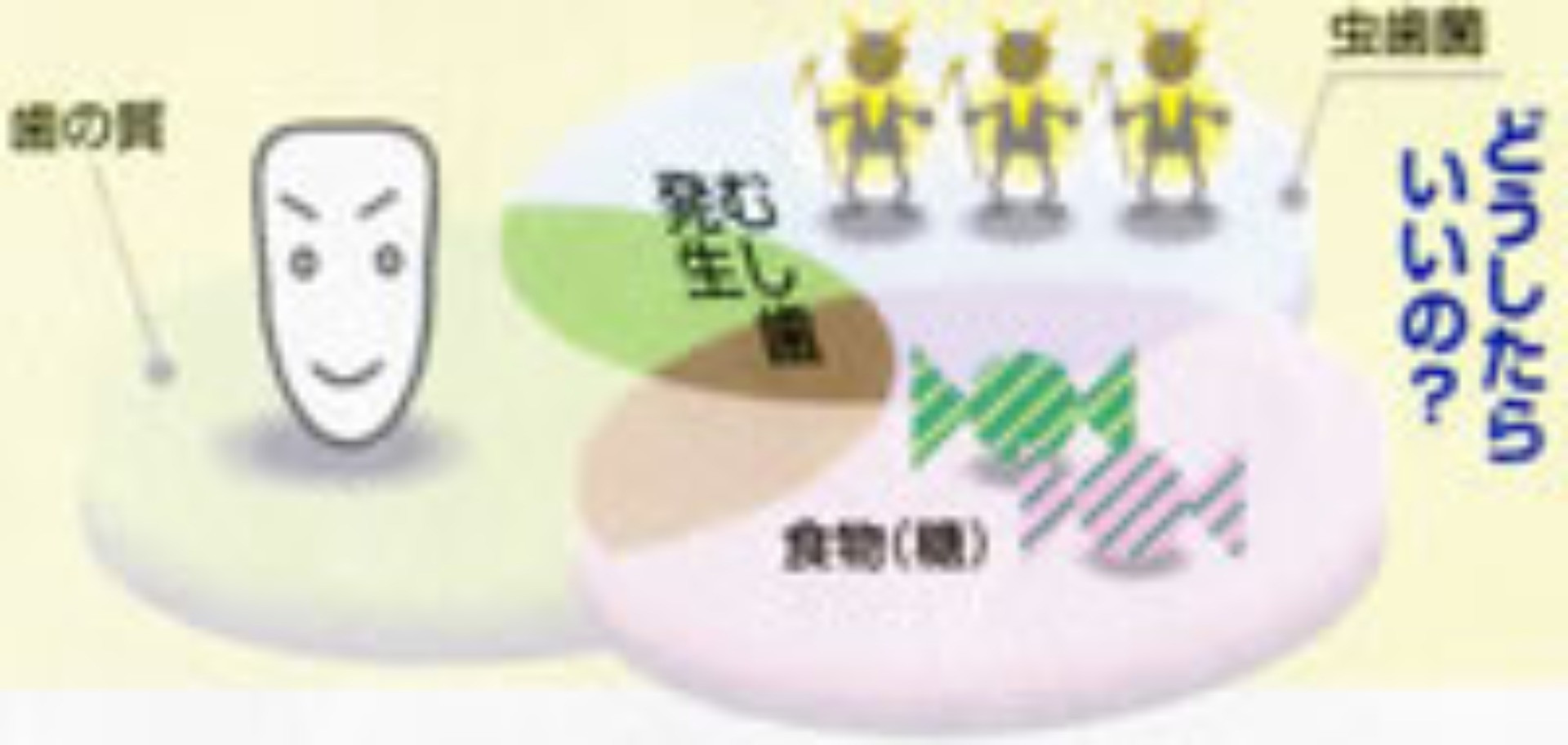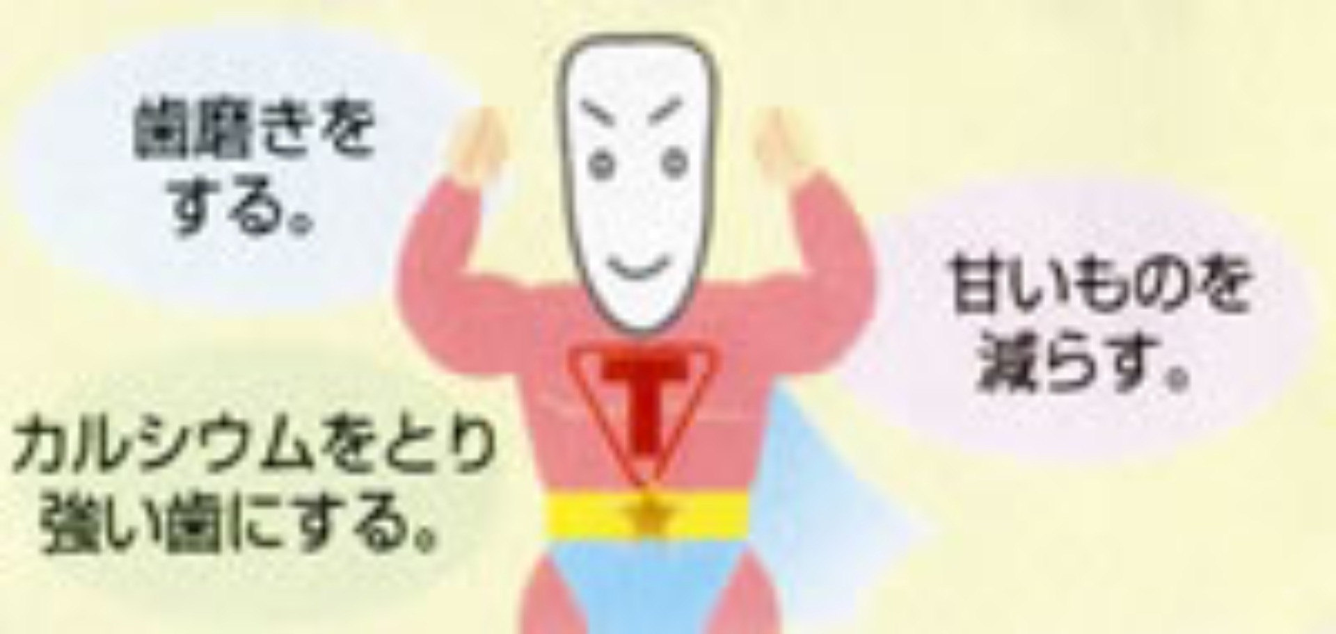 | 口の中にはたくさんの細菌がすんでいます。その中のひとつミュータンス菌が主な虫歯の原因菌です。 | 口の中の虫歯菌が、食べ物の中の砂糖を栄養に、表面にネバネバした物質をつくります。 | そのネバネバした物質の中に虫歯菌や他の細菌が住みつきどんどん増えていきます。これが歯垢(プラーク)といわれるものです。 | 歯垢(プラーク)の中の虫歯菌は食べ物の中の「糖質」を材料に酸をつくり、しだいにエナメル質を溶かしはじめます。これが虫歯です。 |