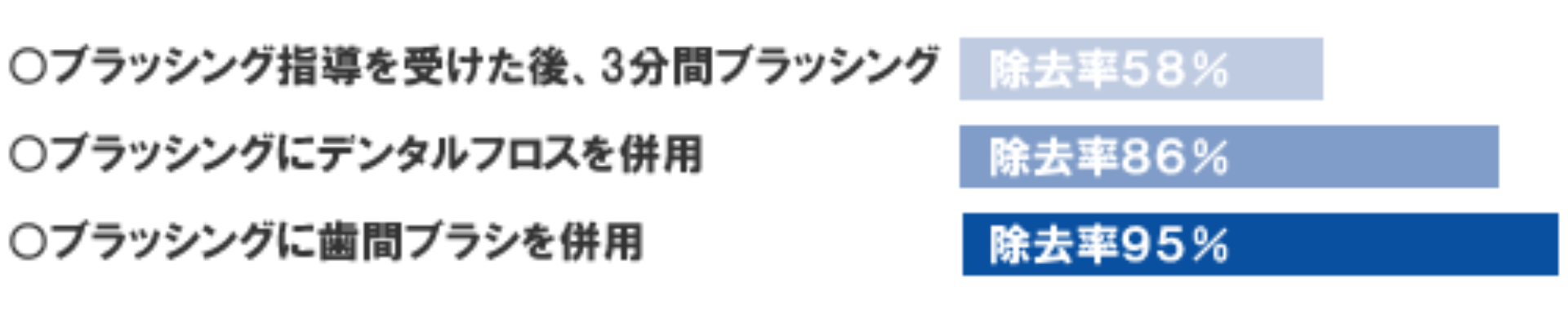原因は「歯と歯の間」や「歯と歯肉(歯ぐき)の境目」にひそんでいるプラーク(細菌のかたまり)なのです。下のデータを見れば明らかなように「歯ブラシ」と「歯間清掃具}を併用することでプラーク除去率を飛躍的に高めることが出来ます。しかし、残念ながら「歯間清掃具」をお使いの方は、まだまだ少数派。歯科医師・歯科衛生士の指導を受けながら、ぜひ効果的な「プラークコントロール」を身に付けてください。 |