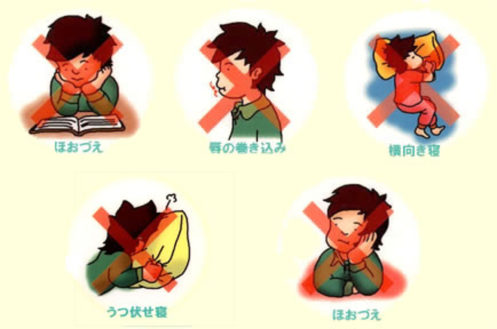 癖で歯並びや噛み合わせが崩れてしまいます。 たとえば頬杖・唇や舌の癖・寝癖(うつぶせ寝・横向き寝など)のような癖によって歯が動き、歯並びが乱れ、噛み合わせが悪くなってしまいます。 噛み合わせが悪いことで顎関節症(あごの痛み・口が大きく開けられない・音がするなど)になったり、全身の姿勢にまで影響を及ぼすことがあります。このような癖を態癖といいます。 態癖の力はワイヤーやゴムの力で歯を動かす歯列矯正の数倍といわれていますので、歯は簡単に動いてしまいます。 態癖をやめることはあなたのお口の健康、ひいては全身の健康を守るために必要なことです。 阿部歯科クリニックでは、態癖に対して積極的にアドバイスしていますので、皆様のご理解とご協力をよろしくお願いします。 |